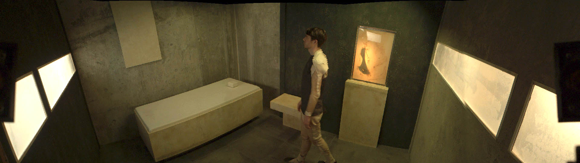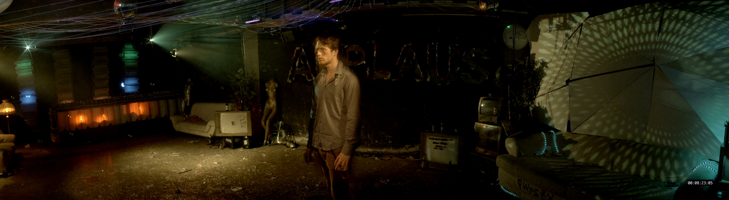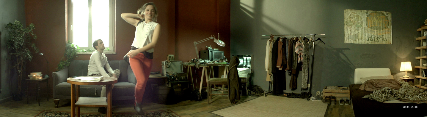 Designing studios sets for a 180° film was a new experience and challenge, which required consideration of a much wider rounded space. The production design was a collaboration effort that originally debuted at a special 180° theatre built for the 63rd Berlinale Film Festival.